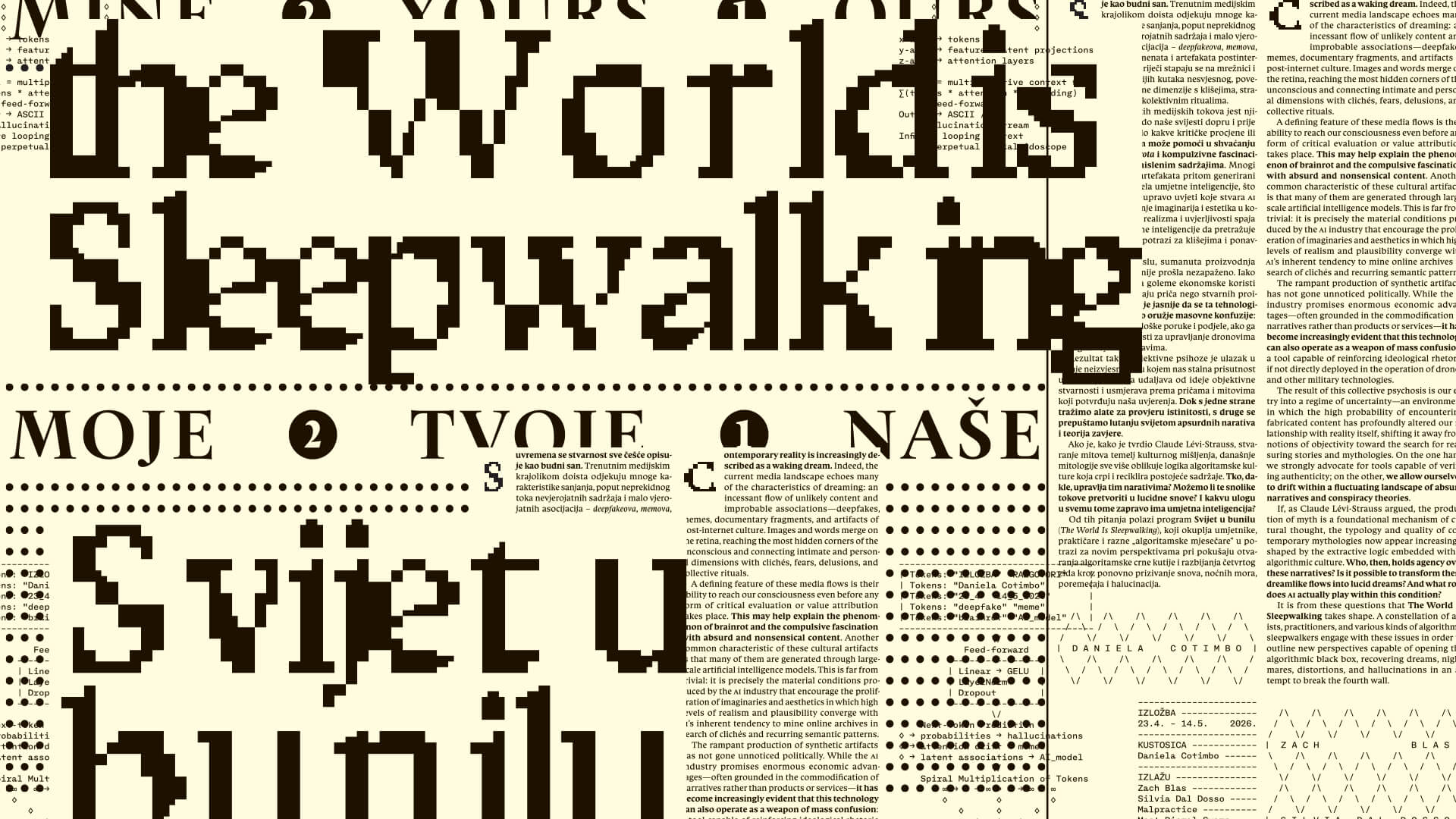 It is from these questions that The World Is Sleepwalking takes shape. A constellation of artists, practitioners, and various kinds of algorithmic sleepwalkers engage with these issues in order to outline new perspectives capable of opening the algorithmic black box, recovering dreams, nightmares, distortions, and hallucinations in an attempt to break the fourth wall.