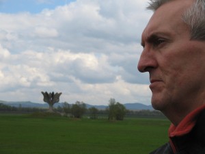Lawrence McKeown with The Stone Flower, the monument to the people executed in Jasenovac, made by Bogdan Bogdanović.